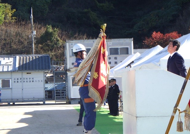 修了の日を迎え,屋外訓練場でこれまでの訓練成果を披露した後,修了式では,来賓を代表して,広島県消防長会副会長(呉市消防局長)の瀬戸龍一氏と濱井会長が祝辞を述べました。